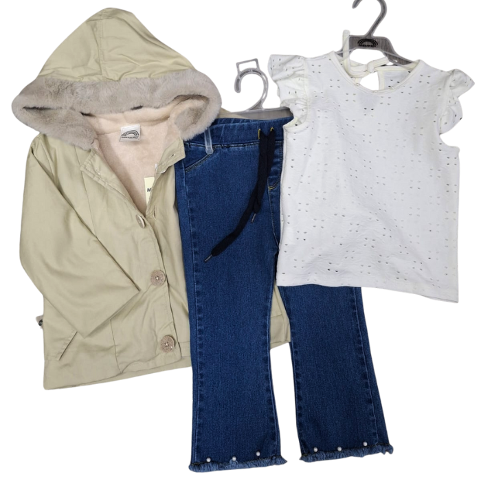 Conjunto importado para niña: incluye jean, blusa blanca sin mangas y un hermoso gabán con capota, forrado en ovejero para máxima protección. Diseñado con botones funcionales que facilitan su uso y lo hacen ideal para días fríos con mucho estilo.