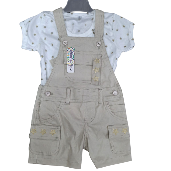 Conjunto importado braga corta en drill beige, con bolsillos lateral funcionales y bolsillo en la parte del pecho, mas camiseta en un delicado estampado de estrellas doradas. Cómodo, funcional y lleno de estilo para tu peque.
