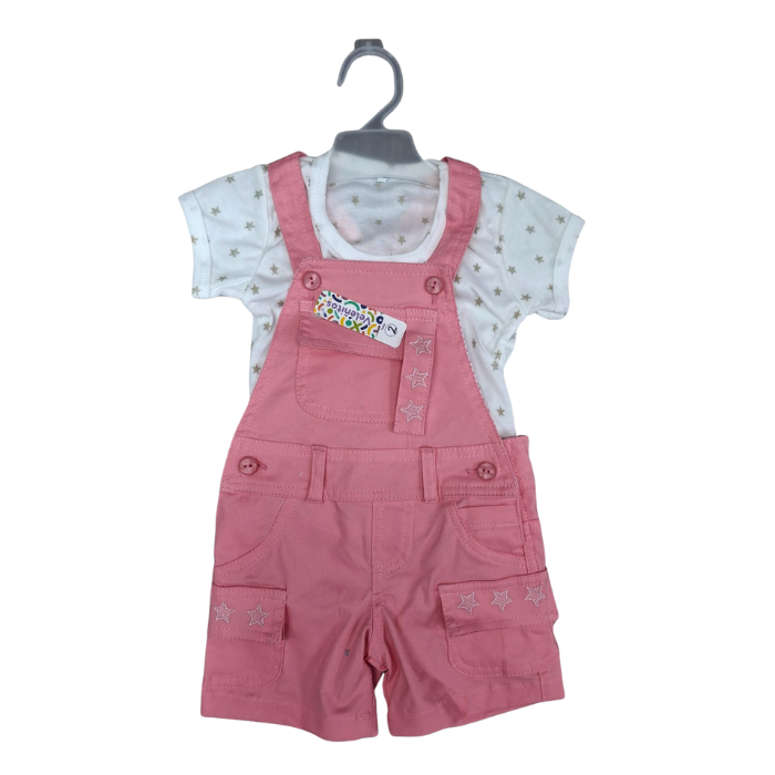 Conjunto importado braga corta en drill rosa, con bolsillos lateral funcionales y bolsillo en la parte del pecho, mas camiseta en un delicado estampado de estrellas doradas. Cómodo, funcional y lleno de estilo para tu peque.