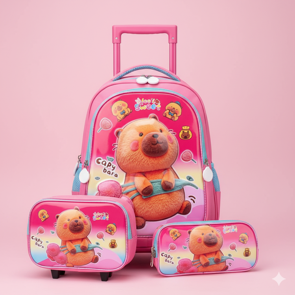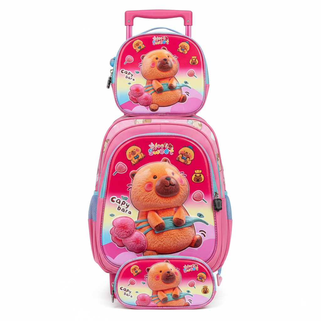 KIT X3 MALETA DOBLE RUEDAS + CARTUCHERA + LONCHERA CAPIBARA PREMIUM